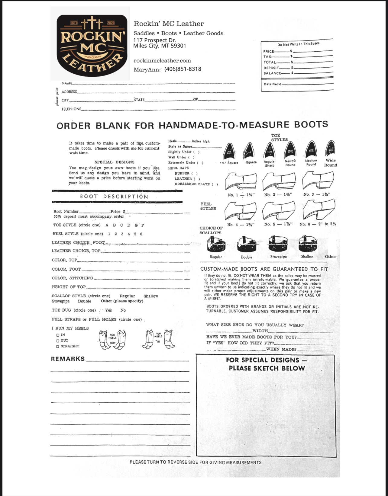 If you are wanting to order a custom pair of boots, please click on this form. It will open the form in a new window for you to print off. Please, print it off, fill it out, and email it to rockinmcleather@icloud.com. If you have any issues, please contact us.