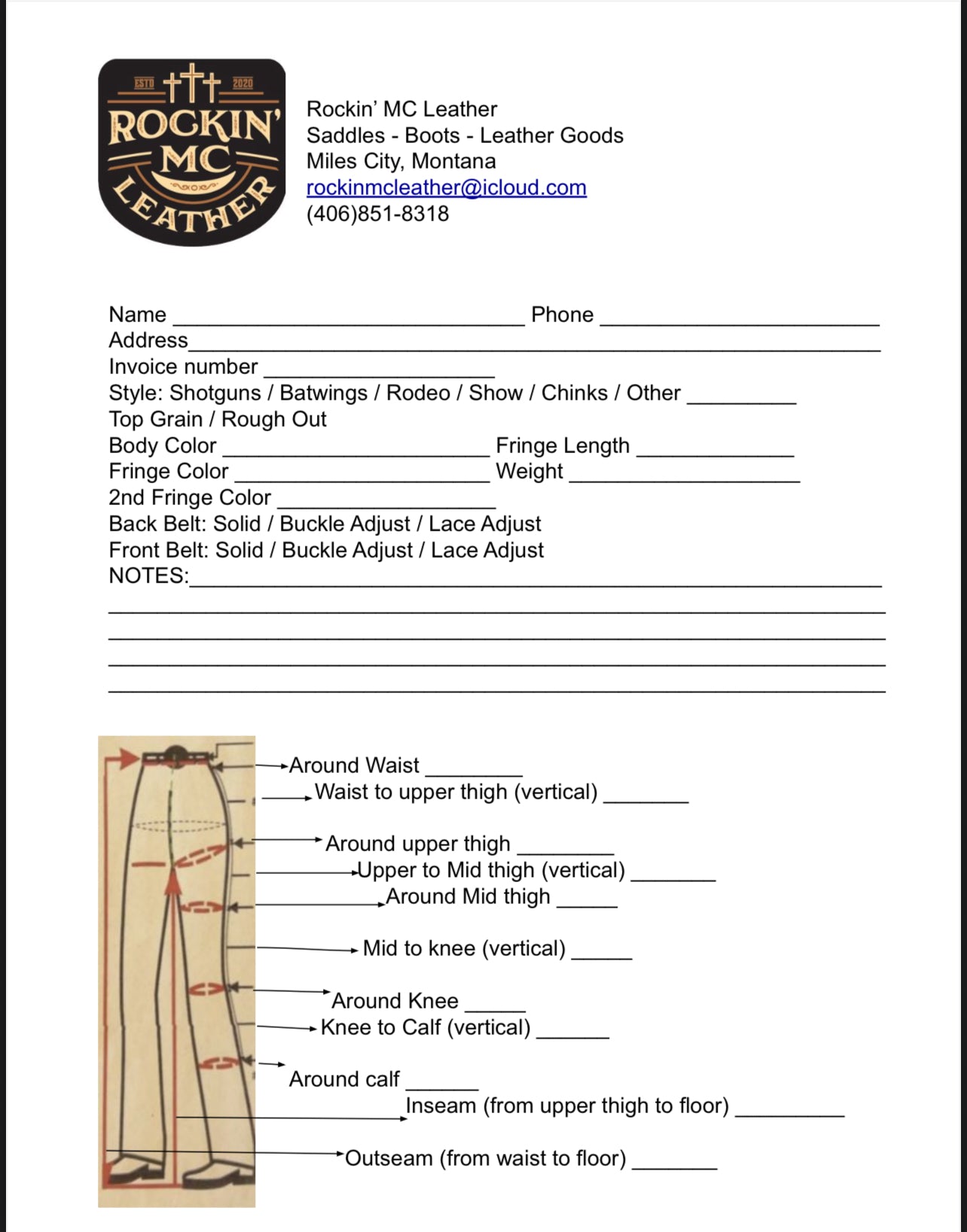 If you are wanting to order custom chaps, please click on this form. It will open the form in a new window for you to print off. Please, print it off, fill it out, and email it to rockinmcleather@icloud.com. If you have any issues, please contact us.