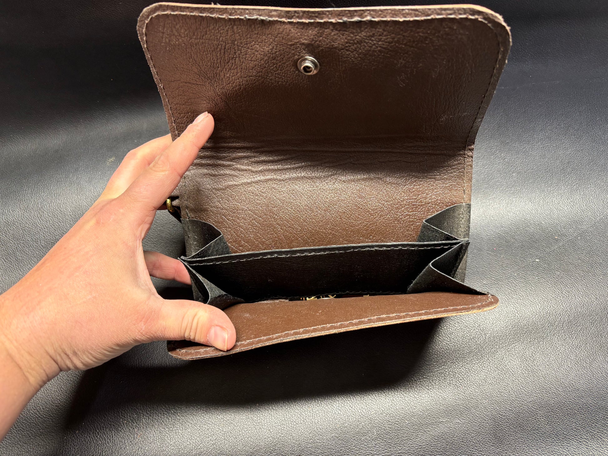 Hand tooled leather clutch with two compartments and snap enclosure.